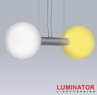 Подвесной светильник с двумя сферами, выполненными из высококачественного белого поликарбоната. Один плафон оснащен светодиодной лентой и системой RGB.