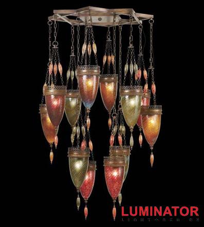 Подвесной светильник. Коллекция Scheherazade выполнена в восточном стиле. Светильники изготовлены из бронзы темного цвета, плафон выполнен из высококачественного стекла ручной выдувки различных оттенков: красный, синий, зеленый или янтарный.