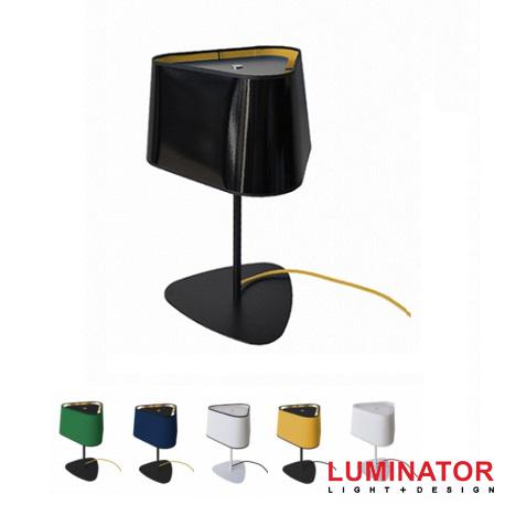 Настольный светильник. Основание изготовлено из лакированной стали. Плафон доступен в следующих цветах: белый, белый с черным кантом, лакированный черно-желтый, желто-золотой, зелено-золотой, сине-золотой. Цветной текстильный шнур служит в качестве декоративного элемента. Фабрика предлагает аналогичный светильник высотой 62см и 39см.