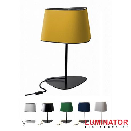 Настольный светильник. Основание изготовлено из лакированной стали. Плафон доступен в следующих цветах: белый, белый с черным кантом, лакированный черно-желтый, желто-золотой, зелено-золотой, сине-золотой. Цветной текстильный шнур служит в качестве декоративного элемента. Фабрика предлагает аналогичный светильник высотой 49см и 39см.